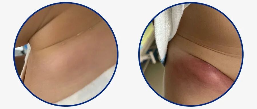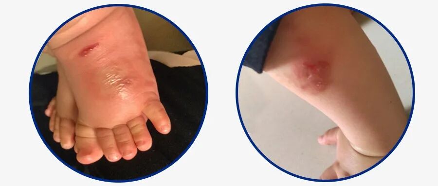她翻出手机照片给林主任看,果然,小悦悦3周前的双下肢多处皮肤红肿、渗出明显,其中一处红肿的皮肤上还能见到一对针眼大小的伤口。